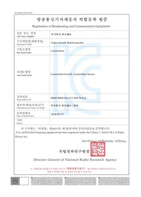 월컨트롤러(ControlOne) 방송통신기자재등의 적합등록